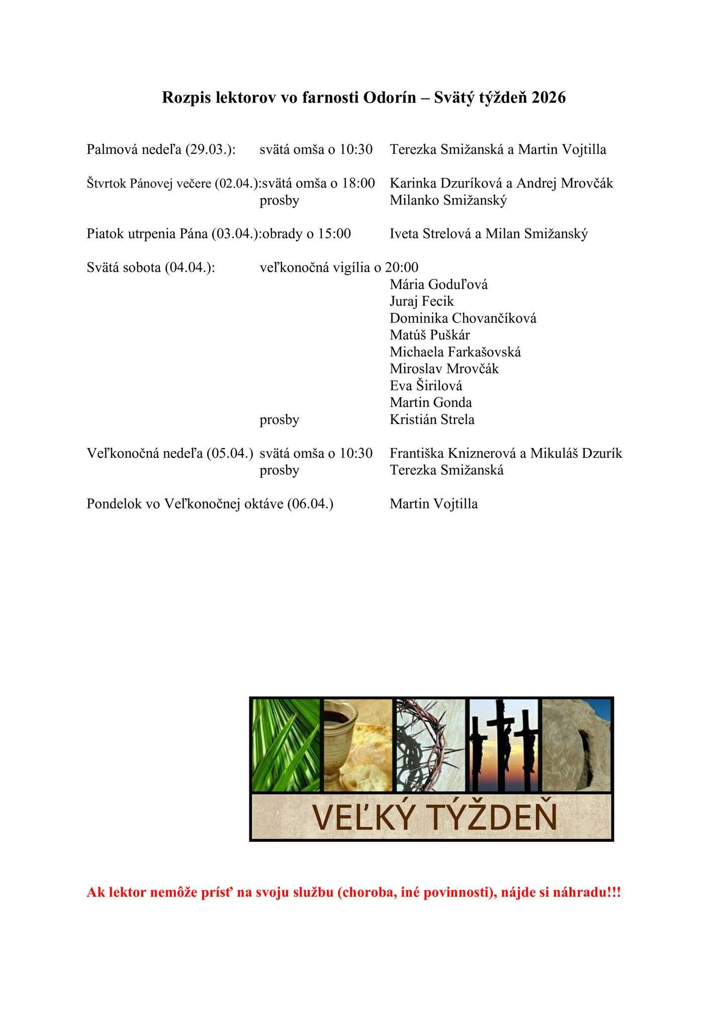 Lektori – svätý týždeň 2026